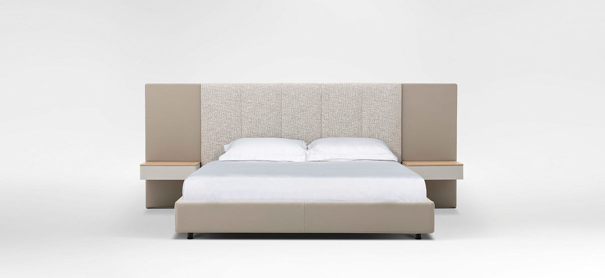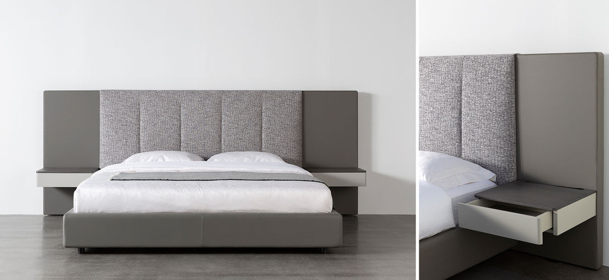 Boasting linear details that everyone can fall in love with, the Stratus Bed is a modern interpretation of a classic design. Balancing lounge-worthy comfort with contemporary tailoring, the bed is fully upholstered with vertical stitching along the headboard. Leather and Fabric combination options takes the bed to the next level of indulgence. Tailor made to suit your individual need; one can channel an easy breezy mood with the narrower version or go dramatic with the wide version which is equipped with two built-in floating nightstands. Harmonizing clean lines and soft simplicity the Stratus Bed will accentuate any bedroom with eye catching proportions.
