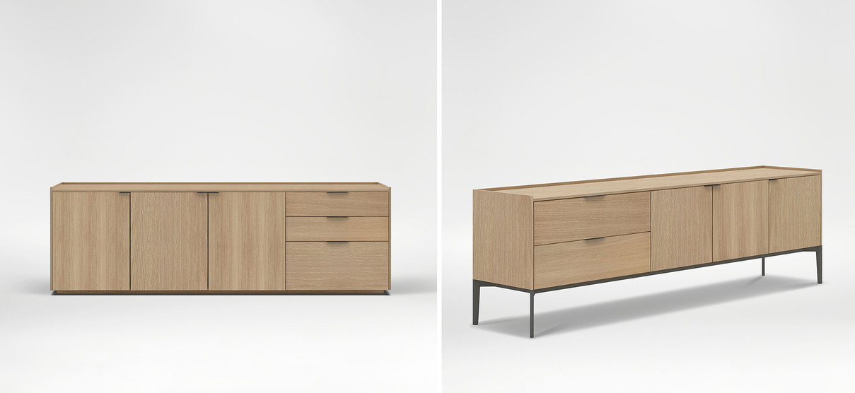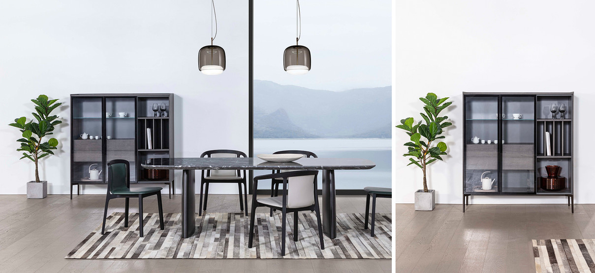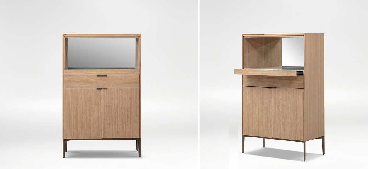 With its signature uplifting base design and sleek drawer handles, the Matrix collection offers an expansive range of functional storage options. From sleek marble selections to matching matte lacquer options, an array of top surface options are available in the line-up. Some variations of the Matrix series is also available in stunning two-tone design, combining matte lacquer colors with Graphite Oak on a single structure. The Matrix Cabinet (High Base) is an eye-catcher visually and highly usable functionally.